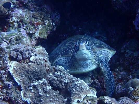 初めは水深5mで沖まで進むと水深10mから15m付近にはサンゴの群生がたくさん見られ、ウミガメもたくさん見れます。またカクレクマノミファミリーがそこら中に見られます。