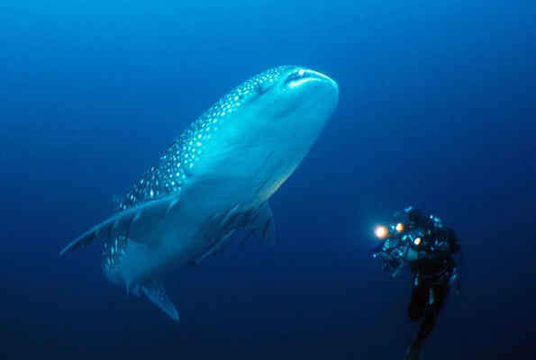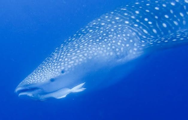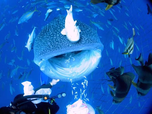 世界最大の魚類、ジンベエザメ。身体にある斑点模様が甚平(じんべい)に似ていることから名付けられ、ジンベイザメとも呼ばれています。大きいものだと13mにもなる巨体に反して、エサは意外にもオキアミなどの小さなプランクトン。大きな口を開けて海水ごとエサを吸い込みます。サメの仲間といっても、性格は穏やかで実はとても臆病!ゆっくりと尾ビレを左右に振って水中を泳ぐのんびり屋さんです。沖縄本島読谷村の港からボートで5分の沖合にはジンベエザメを飼育している生け簀があり、ダイビングやシュノーケルで目の前まで近づくことができます。美ら海水族館の人気者、愛らしいジンベエザメと一緒に泳ぐまたとないチャンス!一生の思い出となること間違いなしです。