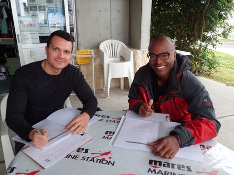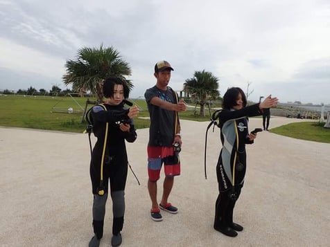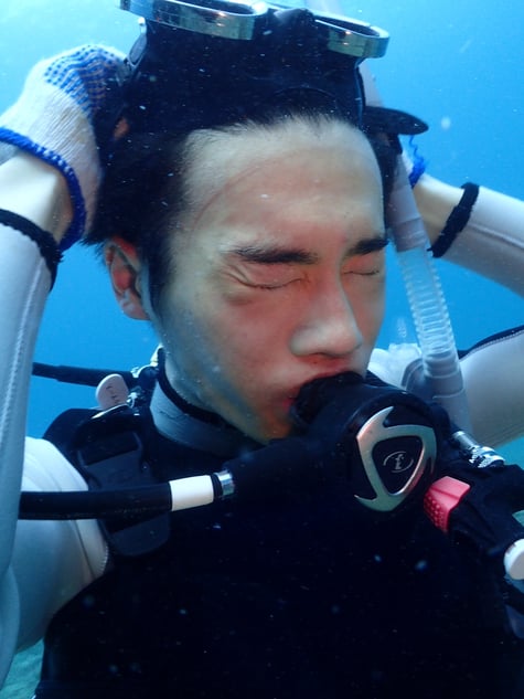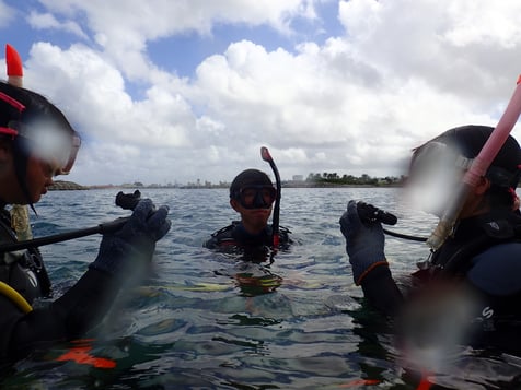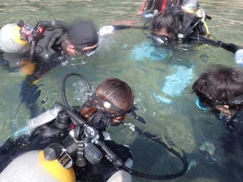 マスクは完全防水ではないため、ある程度は水が入ります。深場に行く前に浅場にて水中でわざと水を入れてクリアするトラブル対策をします。