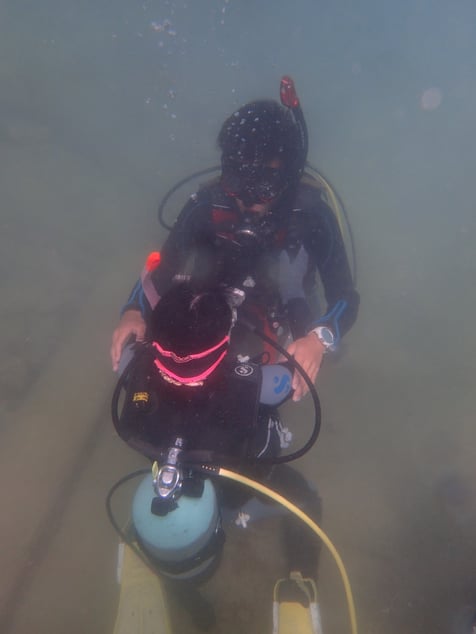 徐々に慣れてきた2mぐらいの水深にて全体の安全確認をします。タンクの重さもあるのでバランスがうまくいかないことがあるとは思います。