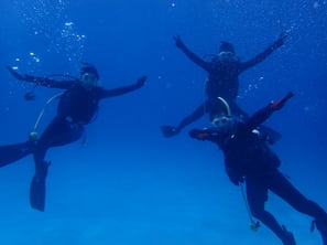誰でも安心して講習ができるように最初は足のつく浅場でスキルを身につけていきます。慣れてきたら水深約5m付近にてスキルの復習や泳ぎ方など新しいスキルを練習します。