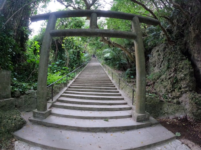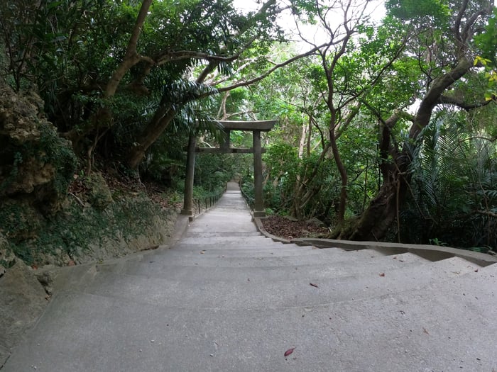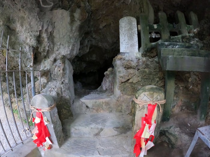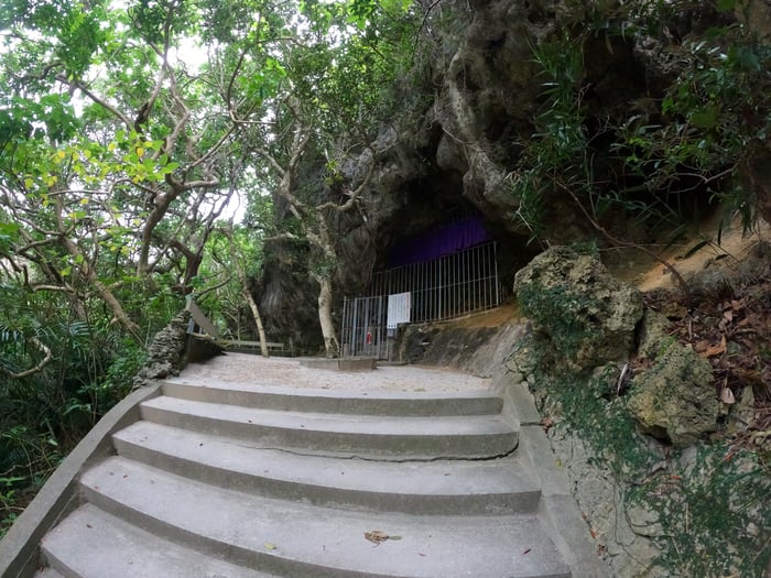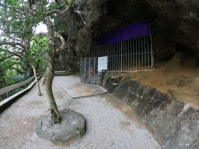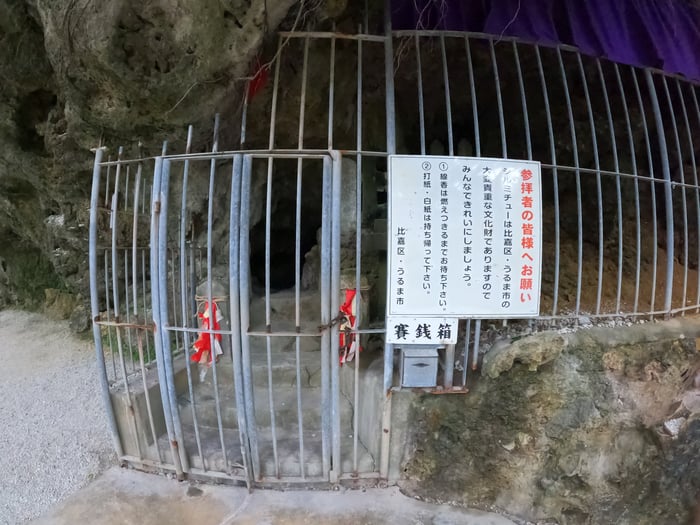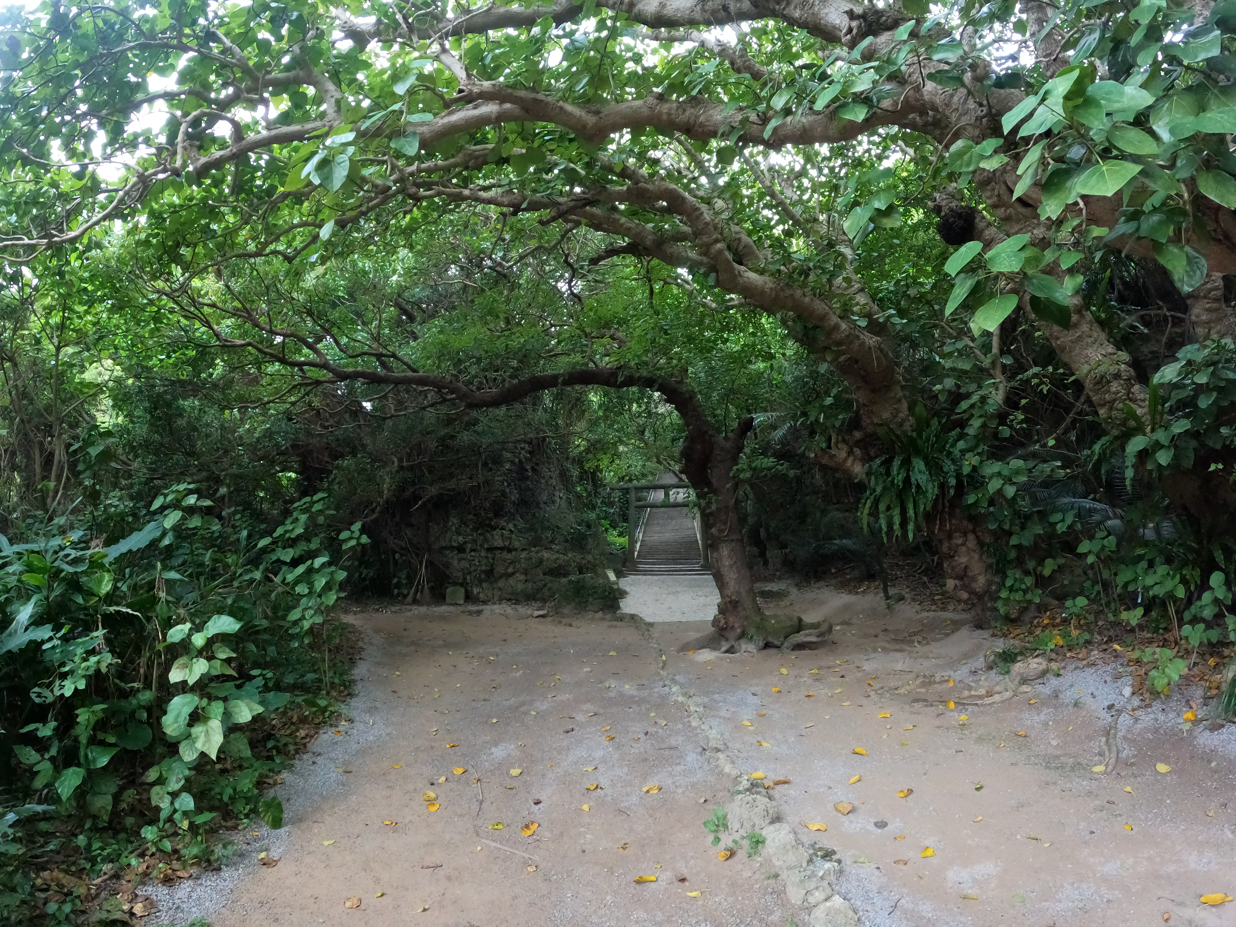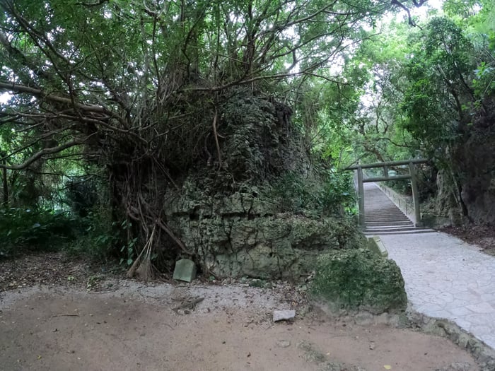 その場所は、うるま市浜比嘉島(はまひがじま)の兼久集落の南側山中にある大きな洞穴です。鳥居をくぐり108段の石段を登りきると、それまでとは違う少しひんやりとした空気を感じ洞穴があらわれます。