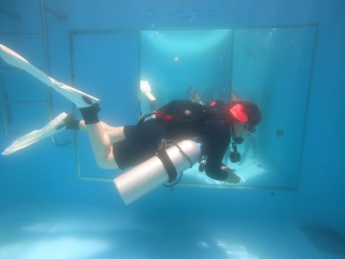 初日の1日目はプールにて講習をいたします。器材のセッティングはもちろん、手軽に入れるプールにて器材の調整をして、スキル練習に入ります。