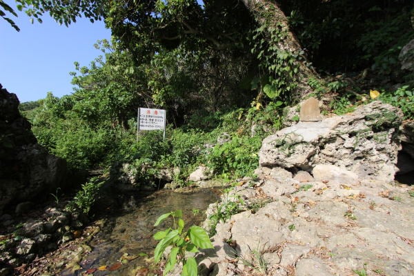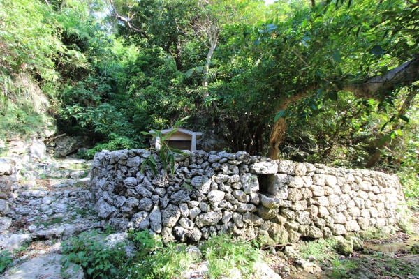 水源地は石灰岩の断崖の奥深くに位置。井泉の後ろにある「うふぁかる」には、琉球の創世神・アマミキヨが天から稲を持ち帰り、この地に初めて栽培したという伝説が残されている。