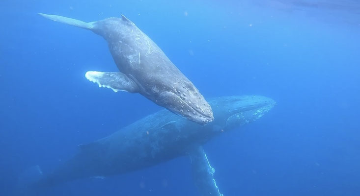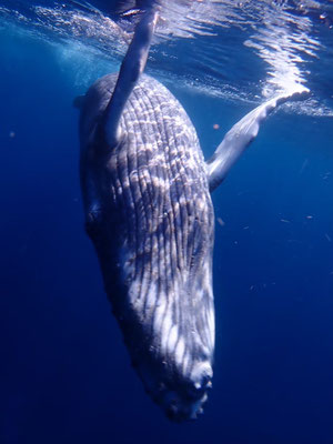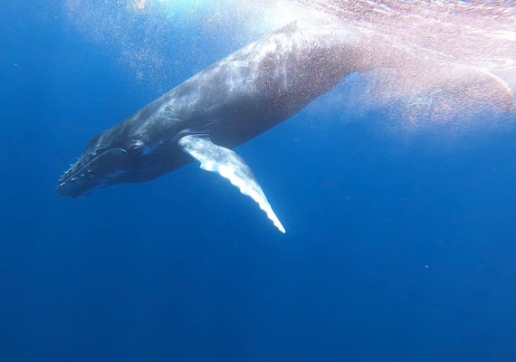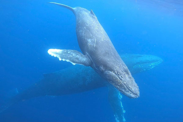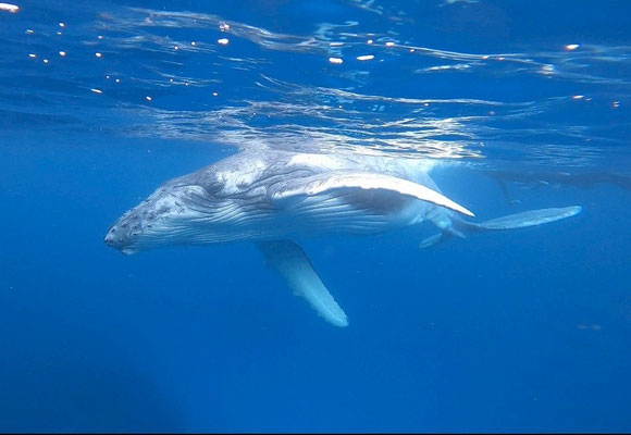 ・ホエールスイムはフリーダイビングとは違い、水中に潜ったり、クジラを追いかけたりすることはできません。クジラの生態を考え驚かしたり、負担をかけないように静かに水面で浮きながらクジラを観察します。